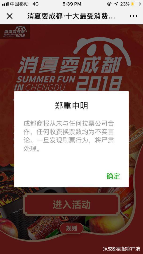 不过火热的氛围也吸引了拉票公司的注意力。近日,成都商报接到举报,候选企业接到冒充成都商报工作人员的短信、微信或电话,相关不法分子想以收费形式帮企业换取高票数,并传播其“为成都商报工作人员”、“保证投票进前十名”等不实言论,在业界造成了一定的恶劣影响。在此,成都商报郑重申明,评选组委会坚持公平、公正、公开原则,不会也无法影响投票结果,从未与任何拉票公司合作。
