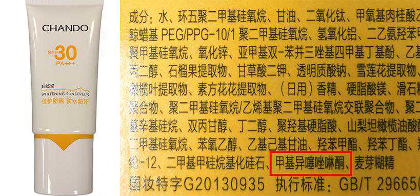 ③下面这款含致敏防腐剂甲基异噻唑啉酮(MIT),这种防腐剂有强致敏性,欧盟已经禁止这种防腐剂在防晒霜中使用。敏感肌肤要注意。
