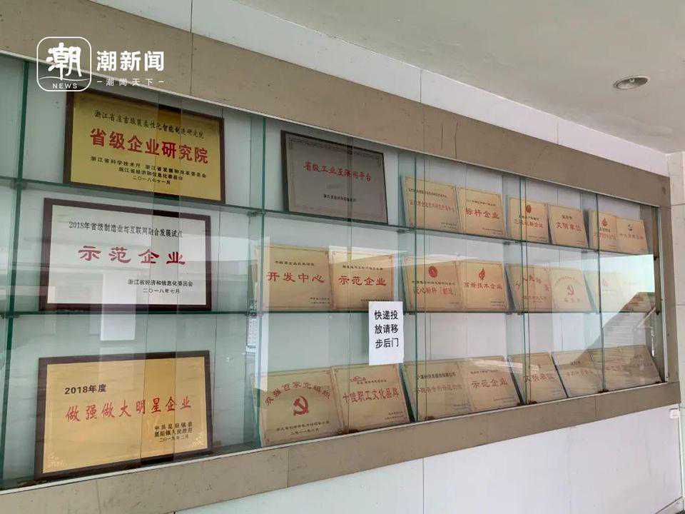 庄吉工业园位于平阳县城主干道京福线旁,占地80亩,虽然身陷困境,但园区仍显示出辉煌时的大气。记者在现场看到,办公楼一楼大厅陈列着满墙奖牌,包括“浙江省高新技术企业”“省级企业研究院”“省级工业互联网平台”等。