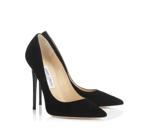 JimmyChoo的这款能呈现完美腿部曲线的黑色绒面尖头细跟高跟鞋,堪称鞋柜里不可或缺的经典款式。